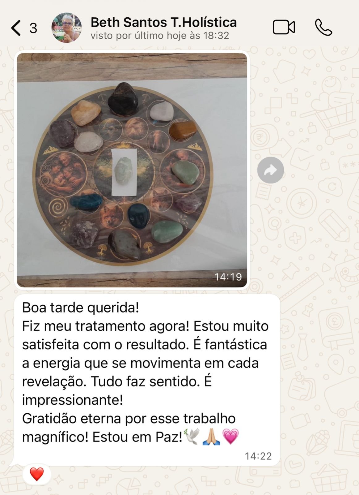 Fiz meu tratamento agora! Estou muito satisfeita com o resultado. É fantástica a energia que se movimenta em cada revelação. Tudo faz sentido. É impressionante! Gratidão eterna por esse trabalho magnífico! Estou em Paz!